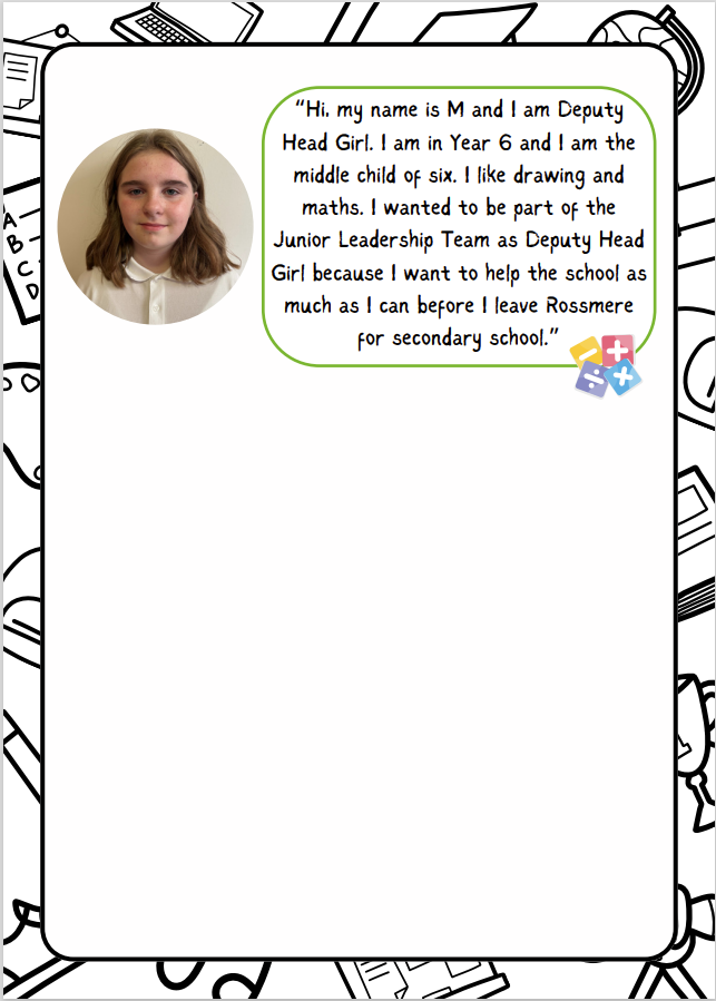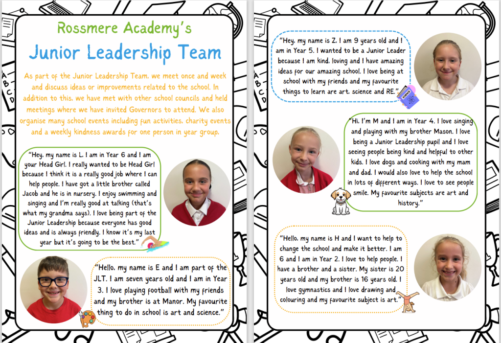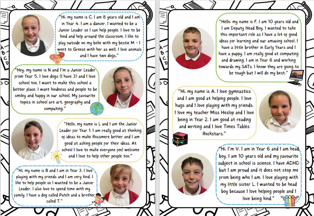 Rossmere children are given many opportunities to learn the skills and characteristics of leadership. They apply for their positions of responsibility and are either selected by a member of staff or voted for by the other children. Within every class children take on responsibilities as monitors. One aspect of our provision that supports this, is offering opportunities to become a ‘Junior Leader’ in many different roles that: